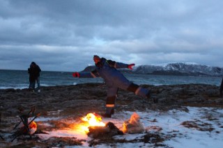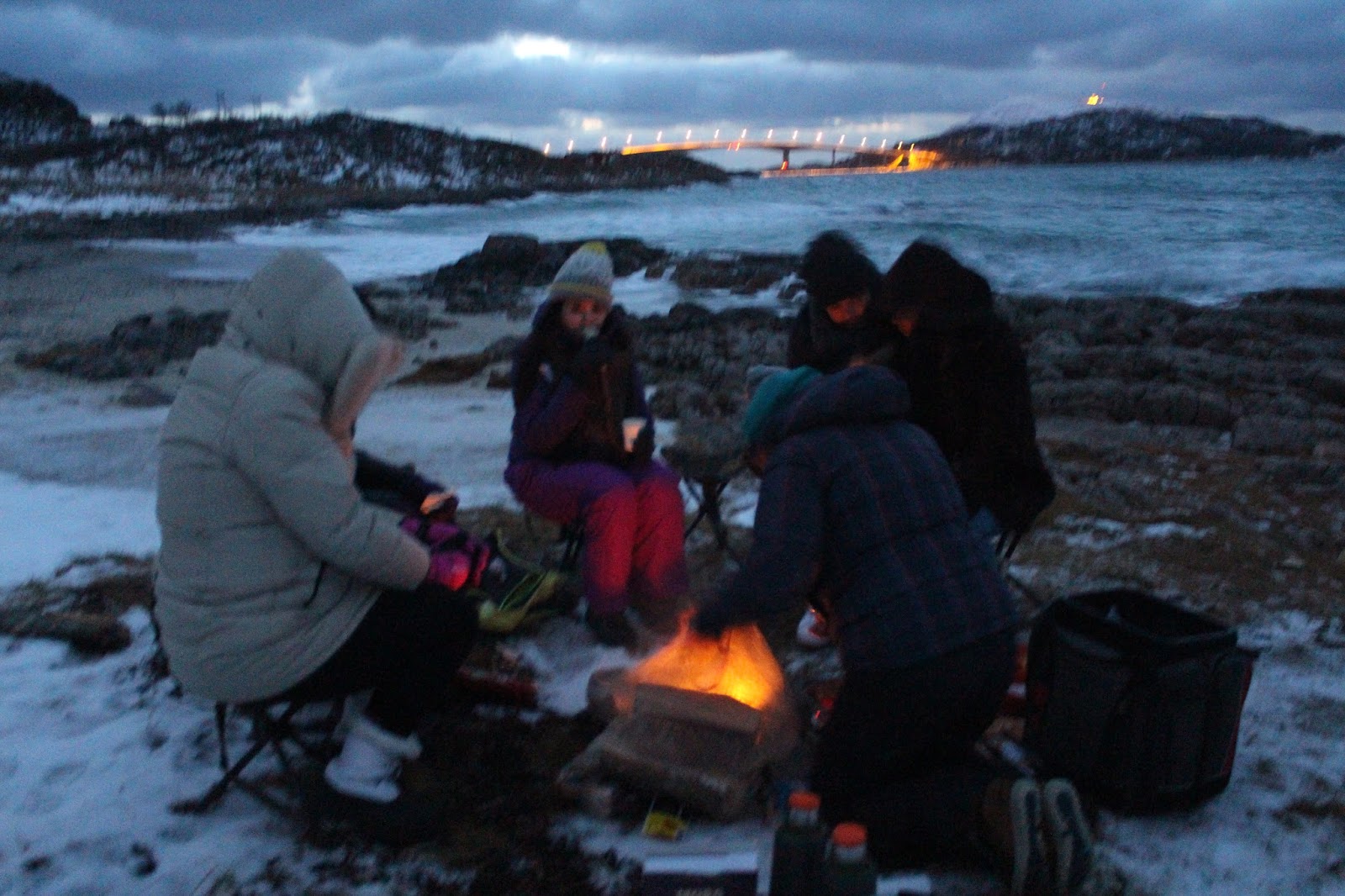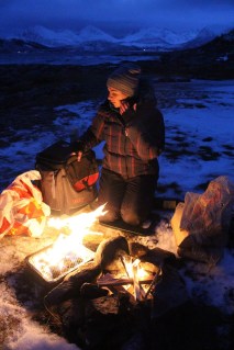 Final stop – another beach, where Anna attempted to light a fire and cook our snack. Hot dogs in wraps for the meat eaters, along with a stick of dried reindeer meat, which M dutifully informed looked and tasted like pepperami. For me – a vegan burger, which, in that cold and after 4 hours of sightseeing was very welcome.