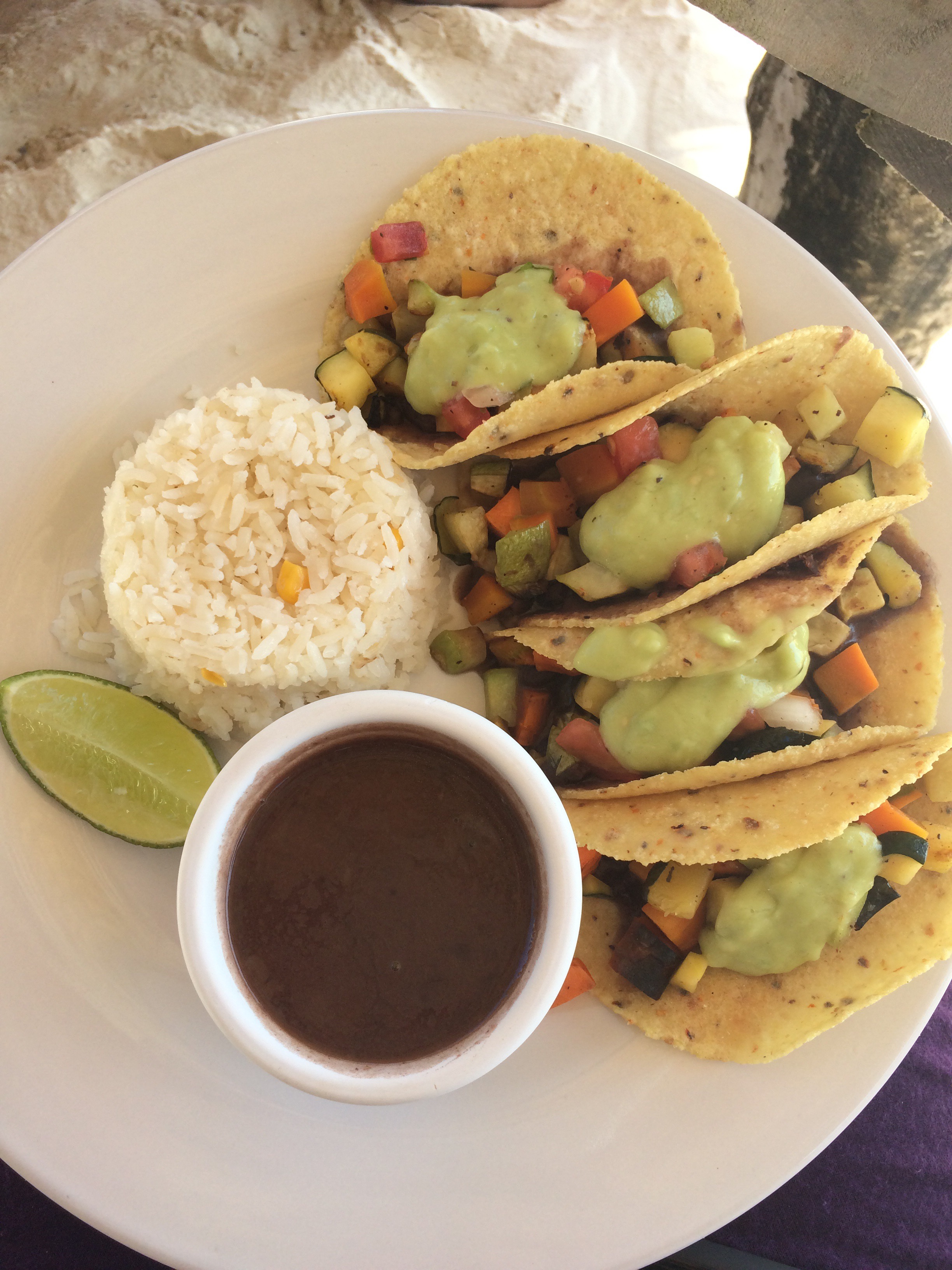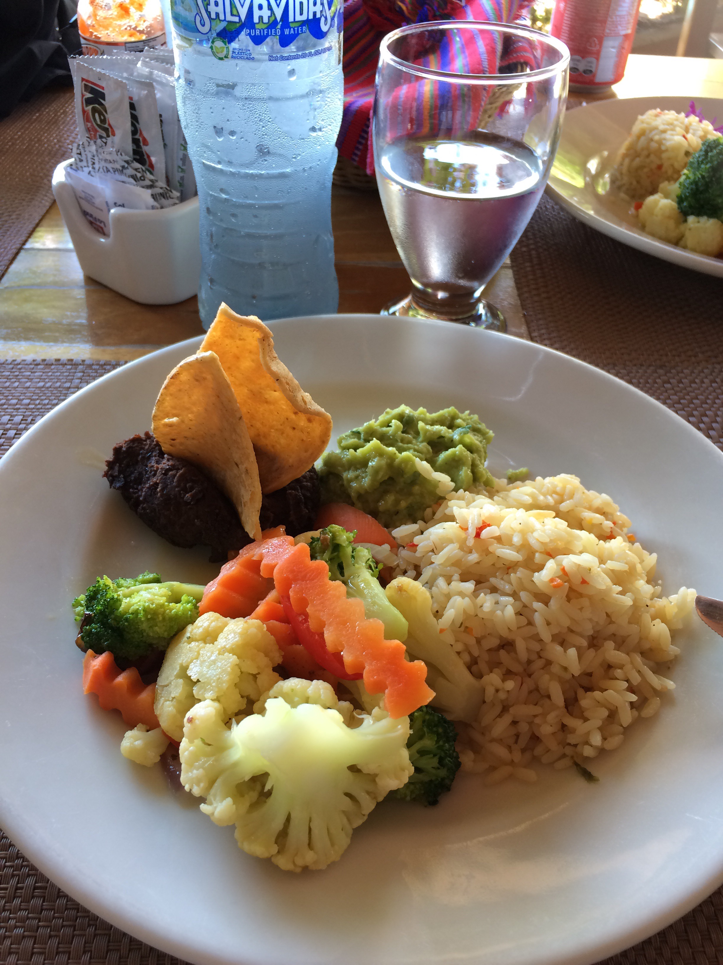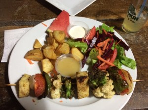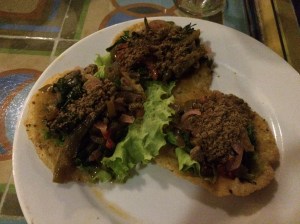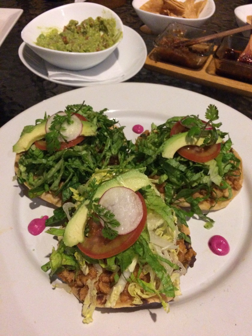 First night dinner – I went for guacamole and salbutes, topped with soya mince, frijoles, radishes, tomatoes, lettuce and avocado.