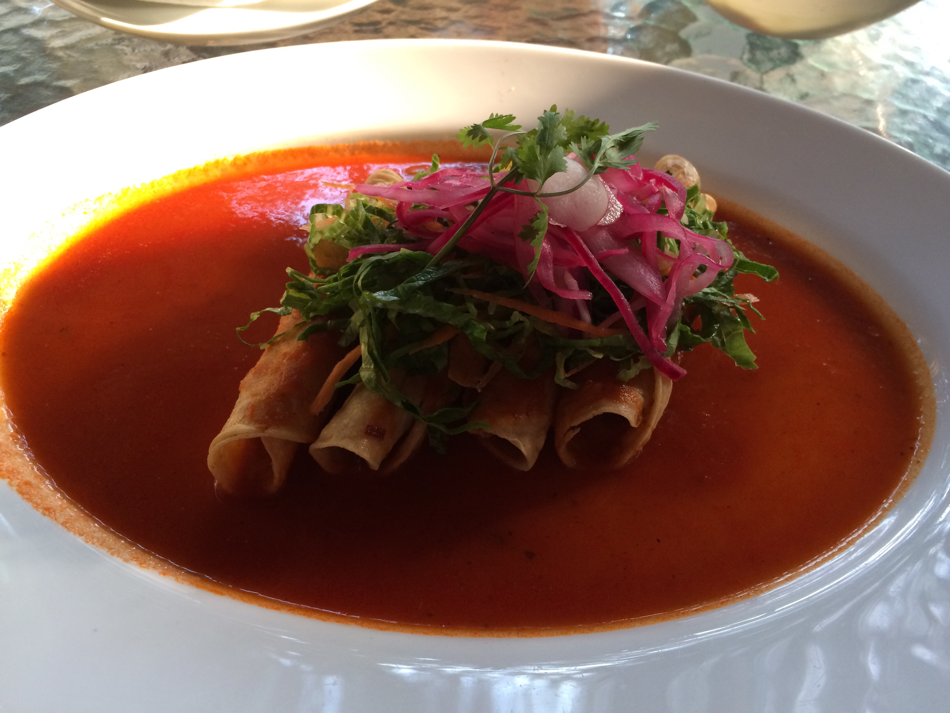 We got back from the ruins pretty late, and decided to have a late lunch/ early dinner at yes, Cafe Jade. Same drink, and Tacos Dorados, or rolled crispy tacos, stuffed with beans and veggies surrounded by this stunning tomato sauce.