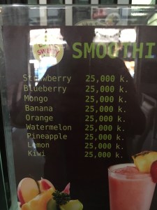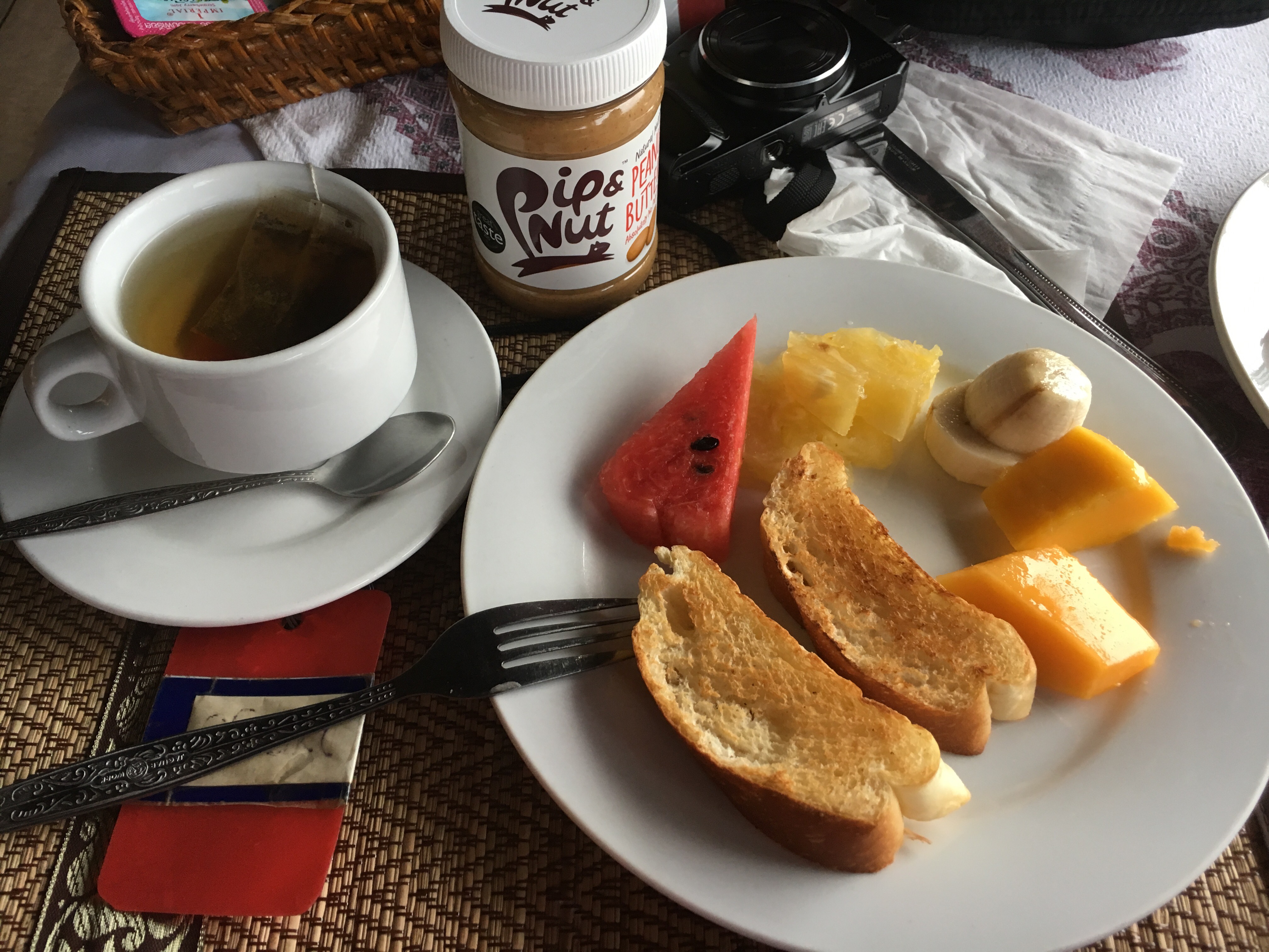 Breakfasts was soft, fibre free, white bread out of which I made banana and PB sandwiches. There was this excellent Loatian tea too – of which I drank copious amounts.