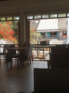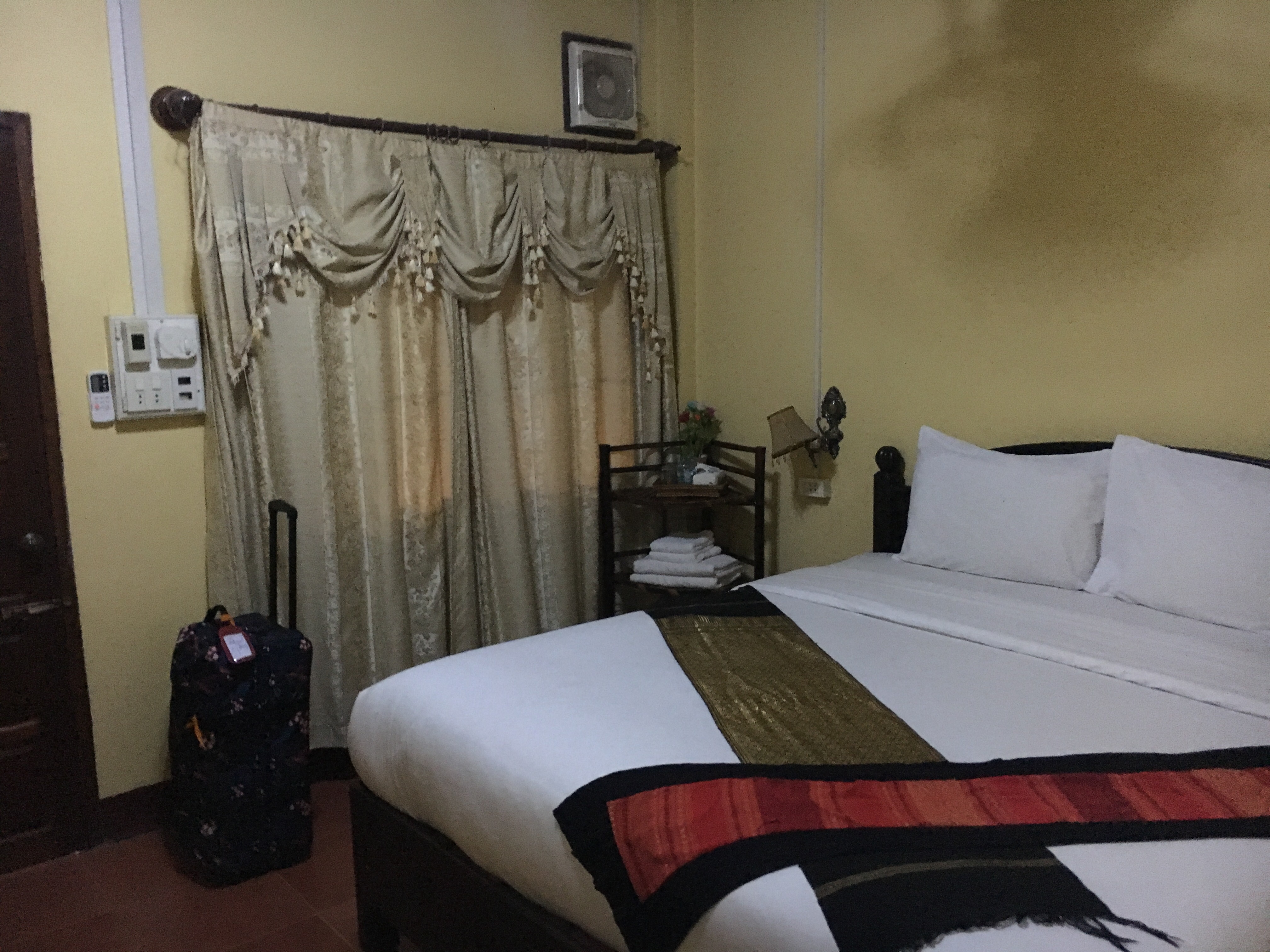 The bedroom was lovely but dark, but I didn’t mind as I was there to sleep. Fluffy towels, complimentary water, loads of sockets. Nice. Along with what I’m realising are the standard Laos hotel room amenities – a fan, a good air conditioner and bum jet.