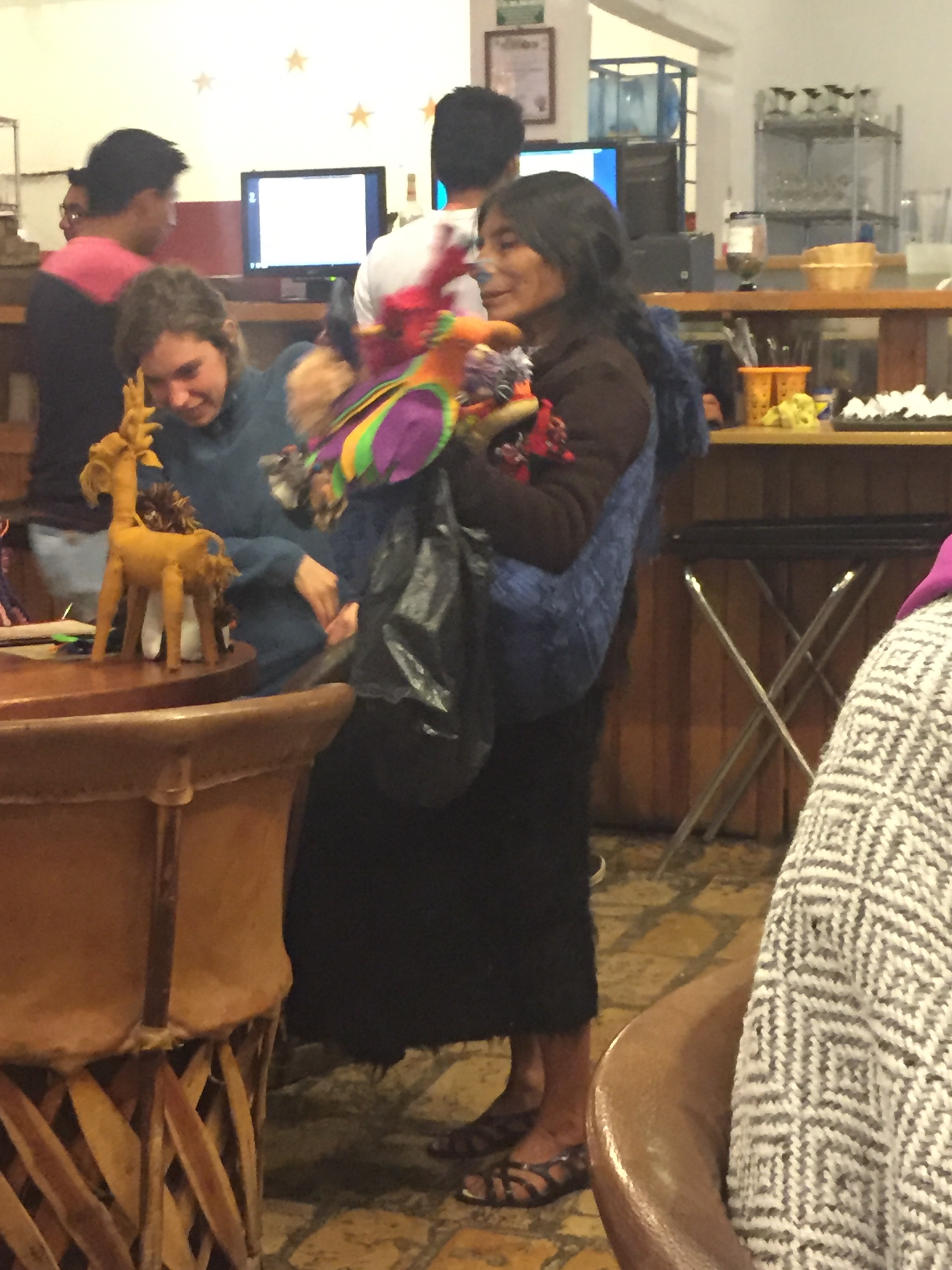 There was this sweet old woman trying to sell her wares. Now most restaurants allow vendors to come in and sell their stuff. Her style was unique. She would walk up to each table, not say a word, lay out all her stuffed animals and then look at you with puppy dog eyes.